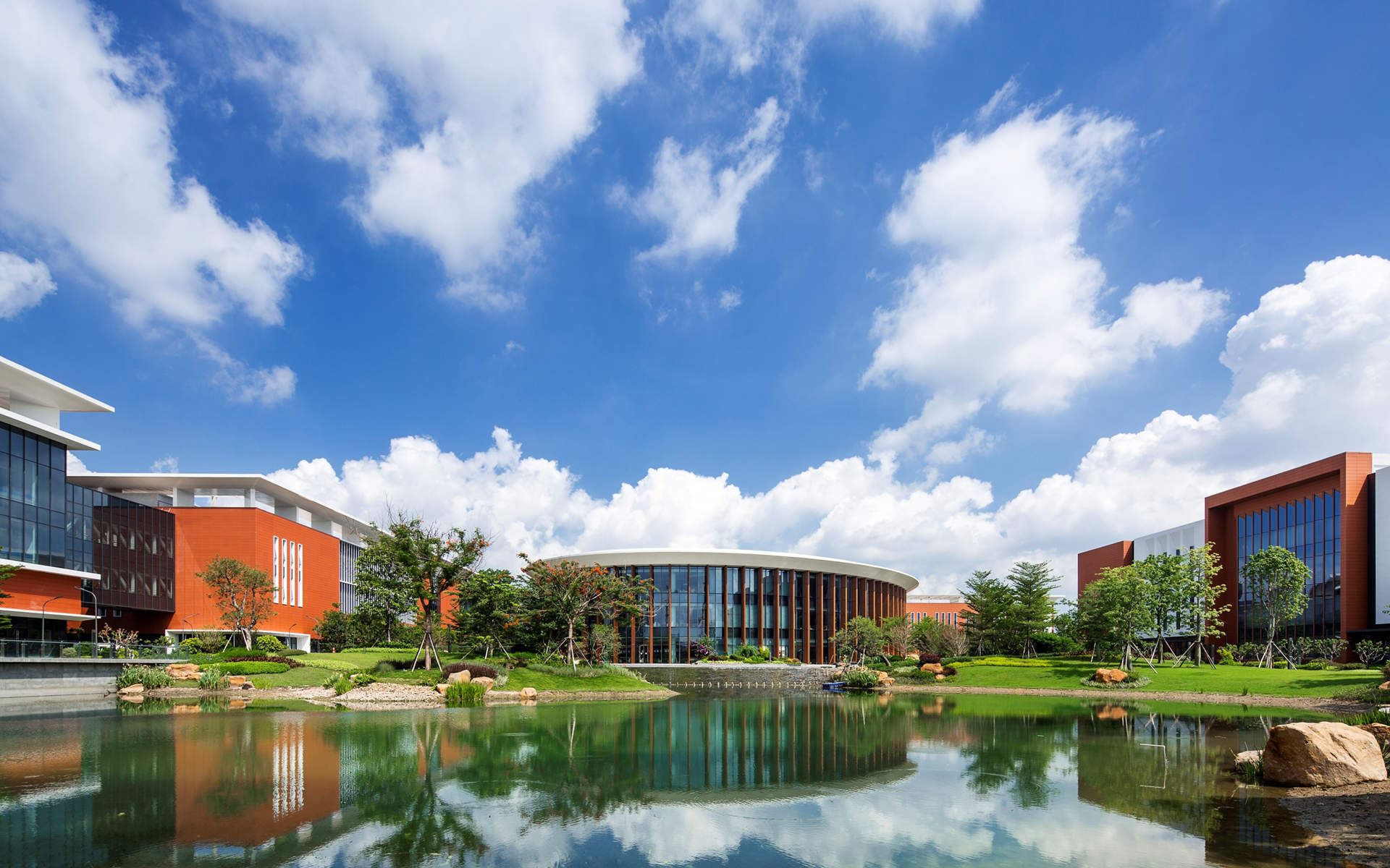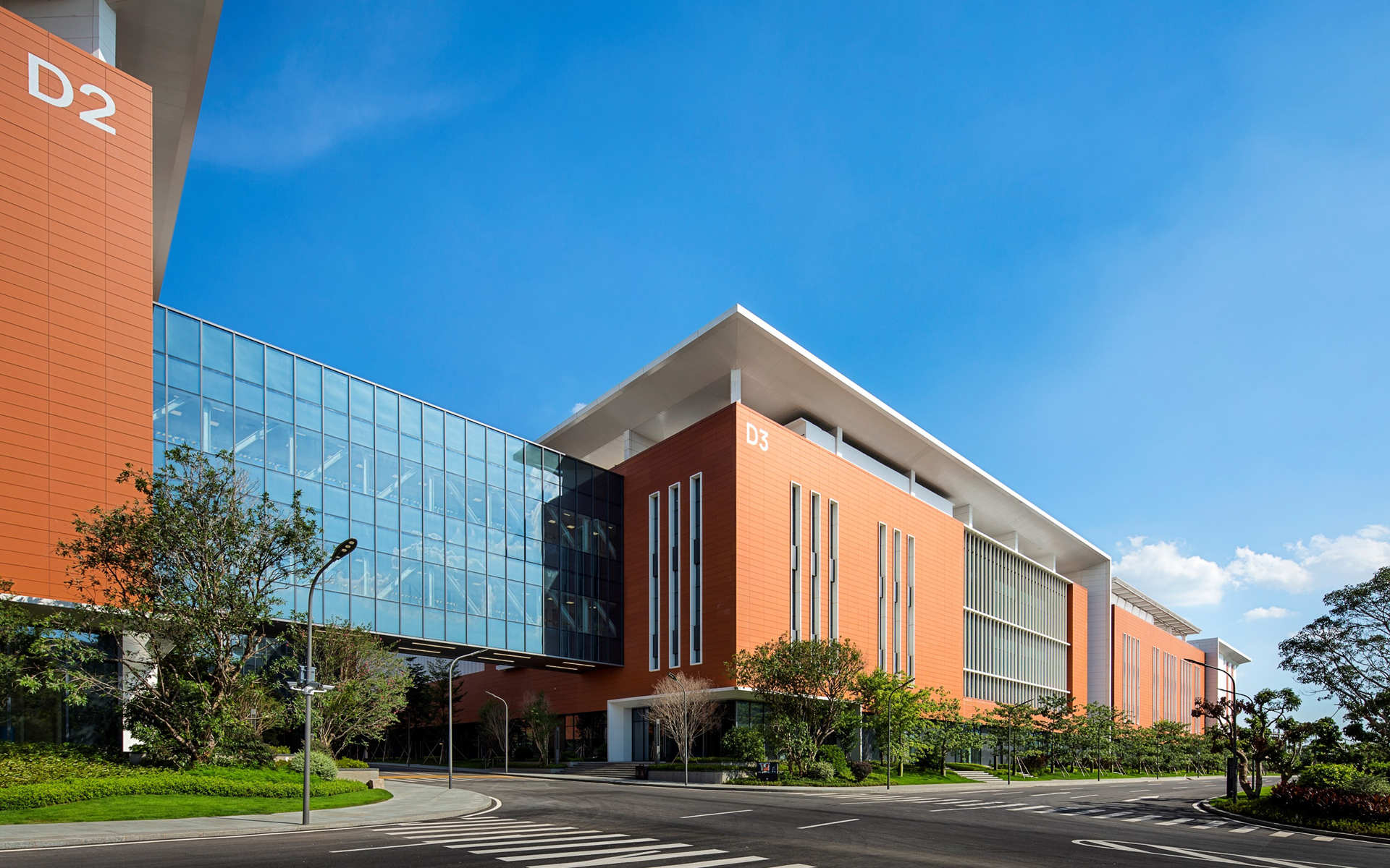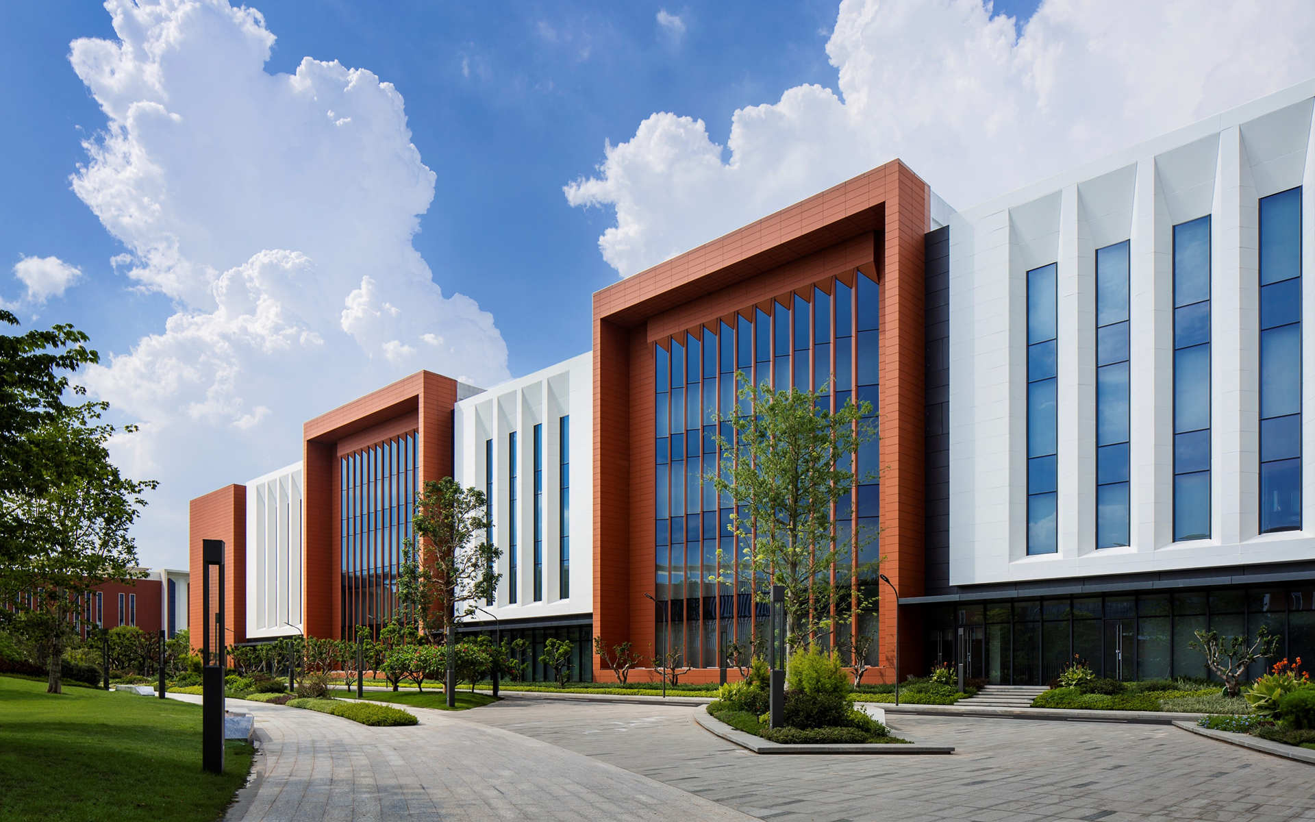 高度细致的立面遵循”功能追随形式”原则,同时又避免设计成人们固有观念里工业园区厂房如一个个“集装箱式的功能盒子”。根据对核心功能的考虑,立面的设计方法分为封闭、半开放和开放立面。欧博迈亚考虑厂房较大的空间尺度,从设计手法而言,更加重视节奏和细节的比例,让园区有较好的近人尺度。同时,外立面整体配色方案都是明快而温暖的,同时也呼应了南方的生活方式。